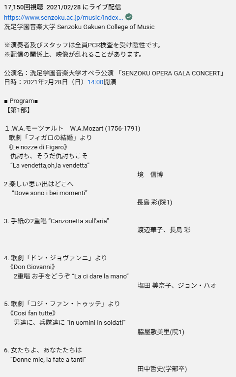 2021年2月28日(日)14:00開演のライブ配信公演「SENZOKU OPERA GALA CONCERT」(洗足学園音楽大学オペラ公演)のプログラムです。