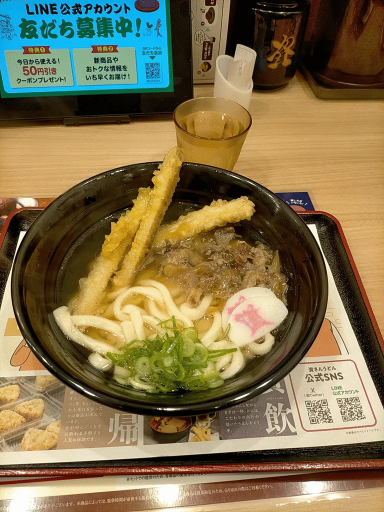肉ごぼ天うどんは、ボリューム満点で、食べ応えがあります。特に、牛肉とごぼ天の組み合わせが満足感を高めており、初めて訪れる人にはぜひ試してほしい一品。