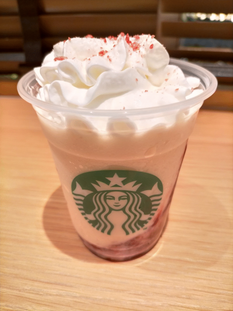 フラペチーノはホリデーシーズンにぴったりな華やかなデザインで、トッピングのホイップクリームにはフリーズドライのストロベリーが散りばめられています。