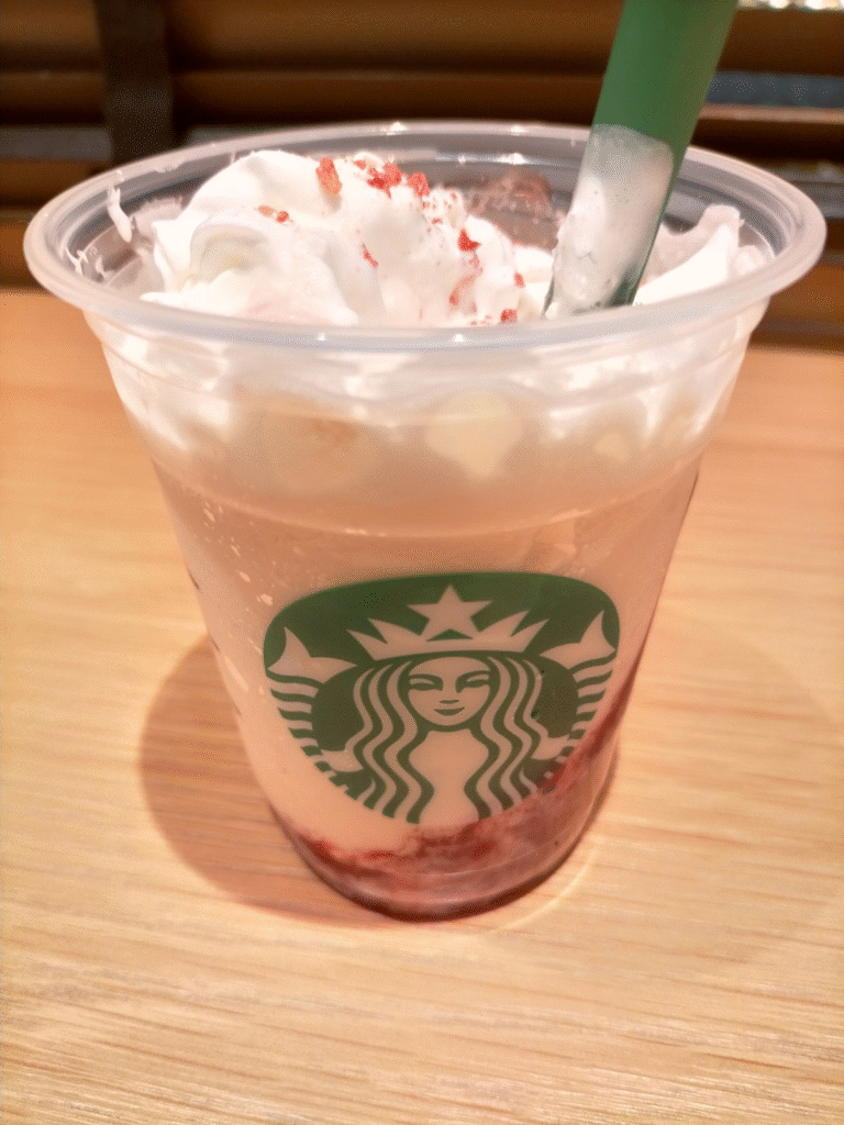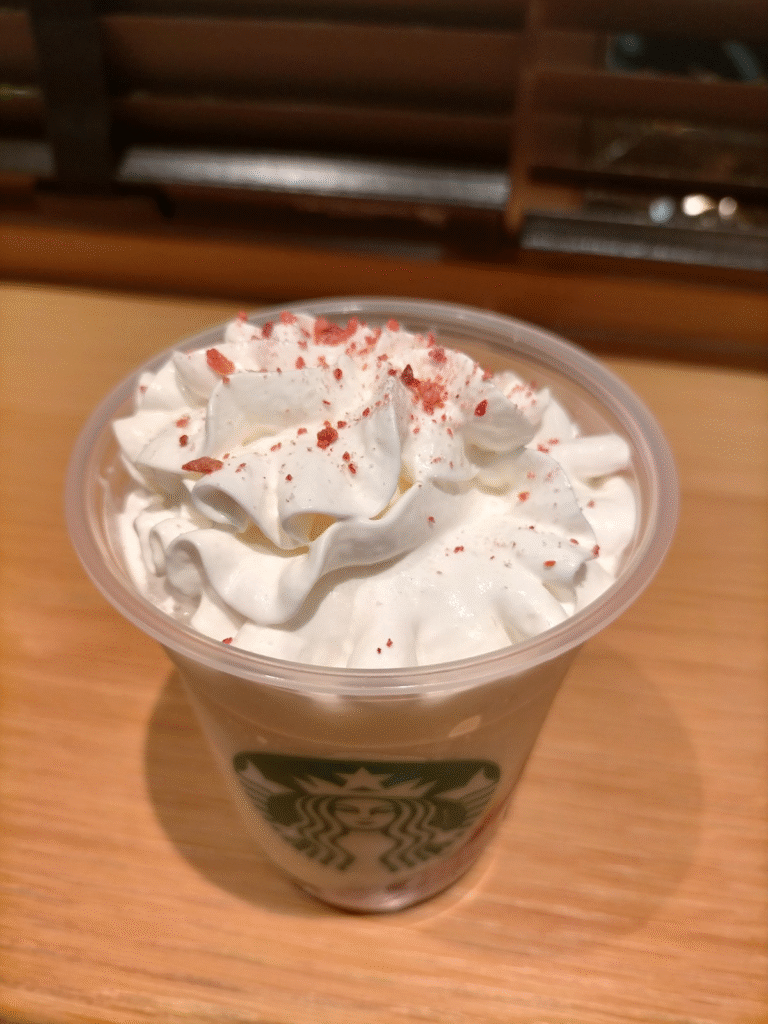 フラペチーノには、ゴロっとしたストロベリー果肉がたっぷりと混ぜ込まれており、甘酸っぱい風味が楽しめます。